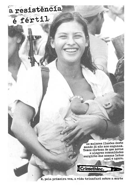 Versão em português do poster que circula desde o fim da década de 1990. O texto é uma citação extraída do livro Prazer Armado de Alfredo Bonanno e a imagem é da guerrilheira da resistência sandinista na Nicarágua e seu bebê, conhecida como La miliciana de Waswalito.