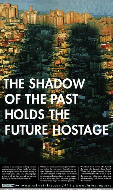 Everywhere across the planet, people were starting to organize themselves, testing their hands at self-directed activities and pushing back when state and corporate interests tried to interfere. As summits of the economic elite were shut down, local collectives assembled, and global networks of resistance linked up, it began to feel like the future was up for grabs. But no one on either side of the barricades had factored in the unsettled accounts U.S. foreign policy had wrought in the third world, and everything changed the day terrorists, directed by a former employee of the C.I.A., brought those chickens home to roost in New York City.